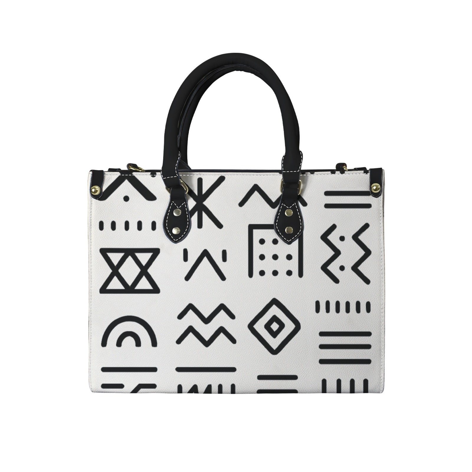Le sac à main Odyssée Magistrale est une célébration de la clarté. Sur son cuir PU blanc immaculé, une collection de motifs africains — zigzags, losanges et lignes — dessine une carte visuelle moderne et audacieuse. C’est le choix idéal pour celles qui recherchent un accessoire capable de structurer une silhouette tout en offrant une fonctionnalité sans compromis.