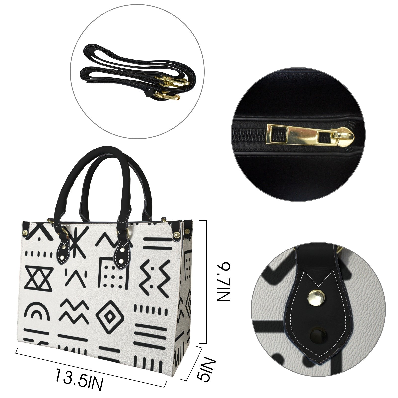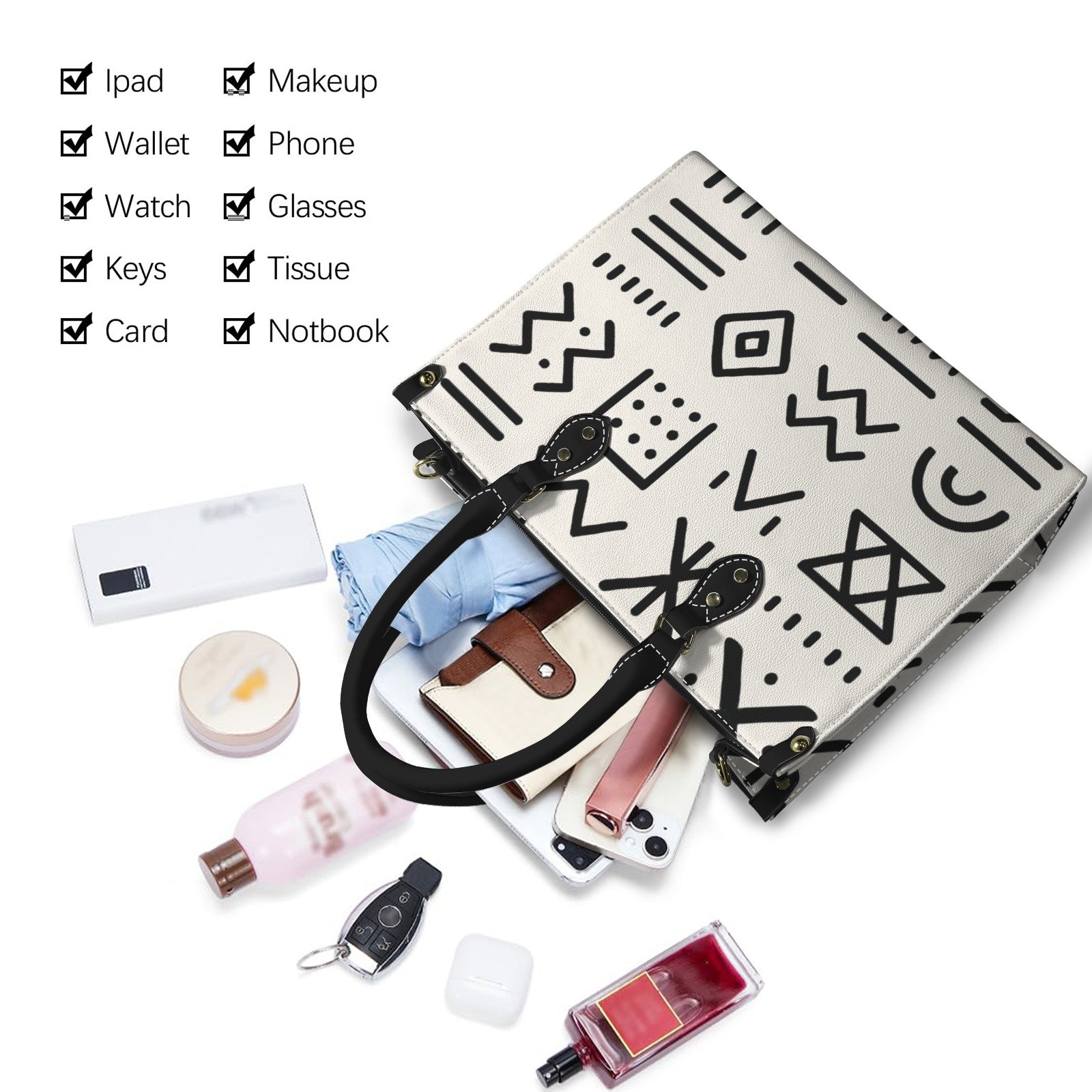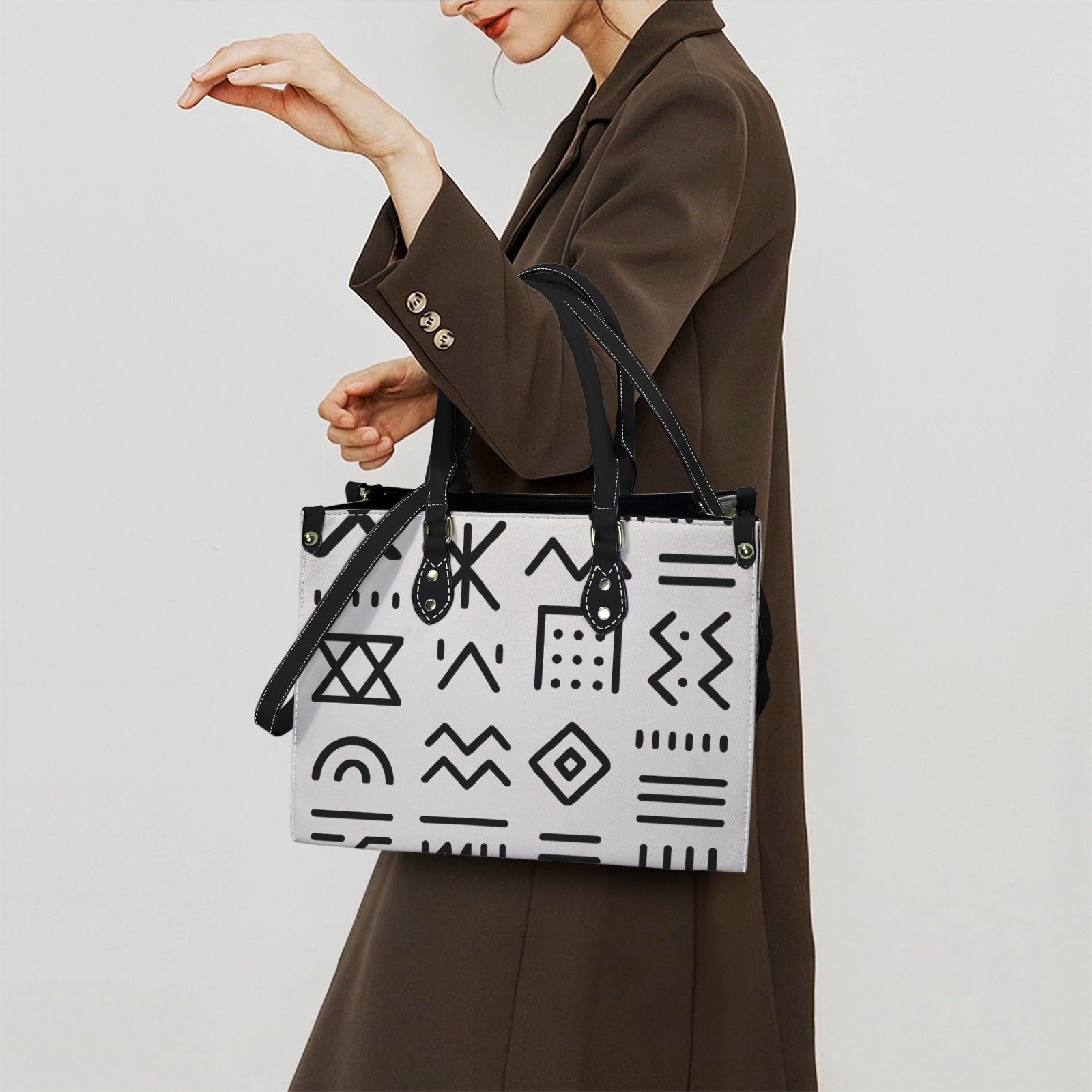 • Style : Un sac à main cabas au design contrasté, arborant des symboles graphiques noirs sur une base blanche minimaliste.